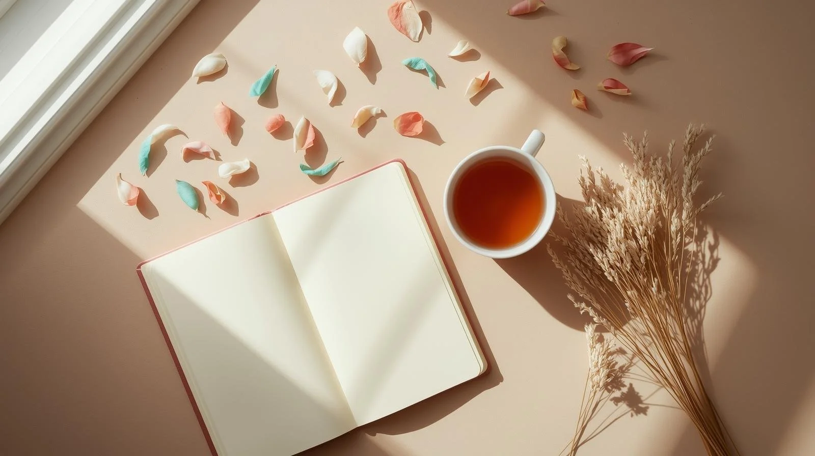 A soft, cozy flat-lay featuring a journal and tea in warm light, symbolizing reflection, healing and a gentle pace of life.